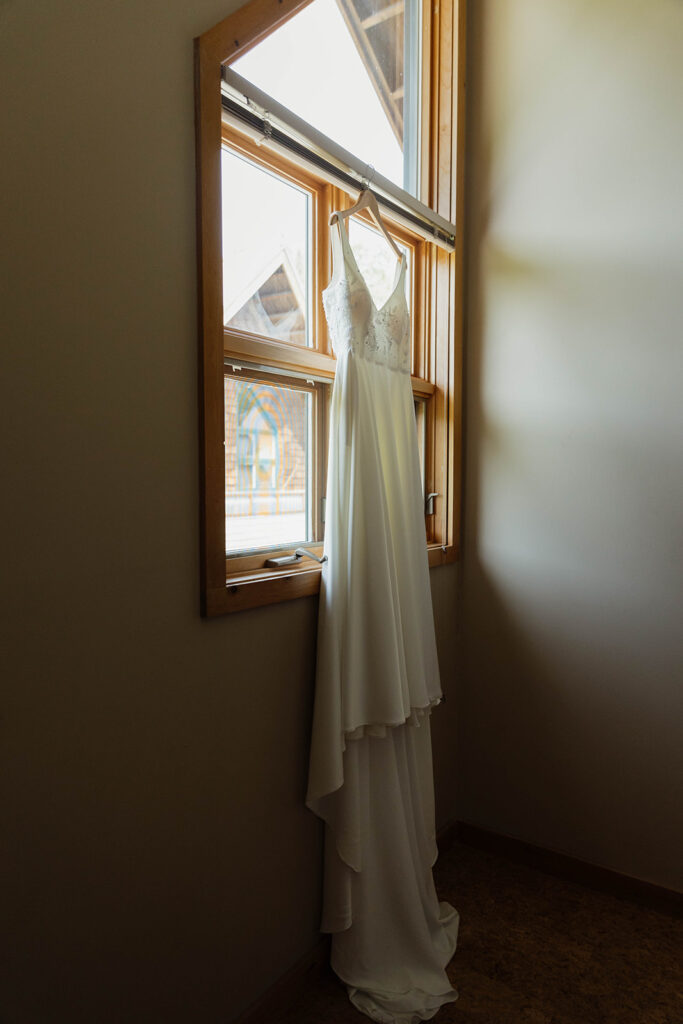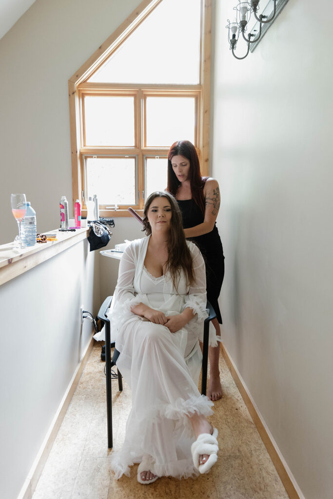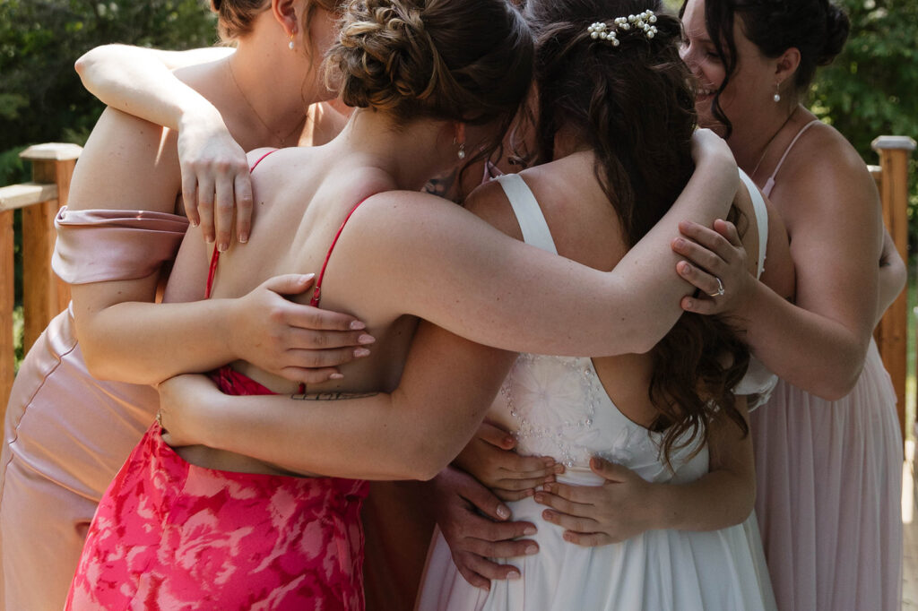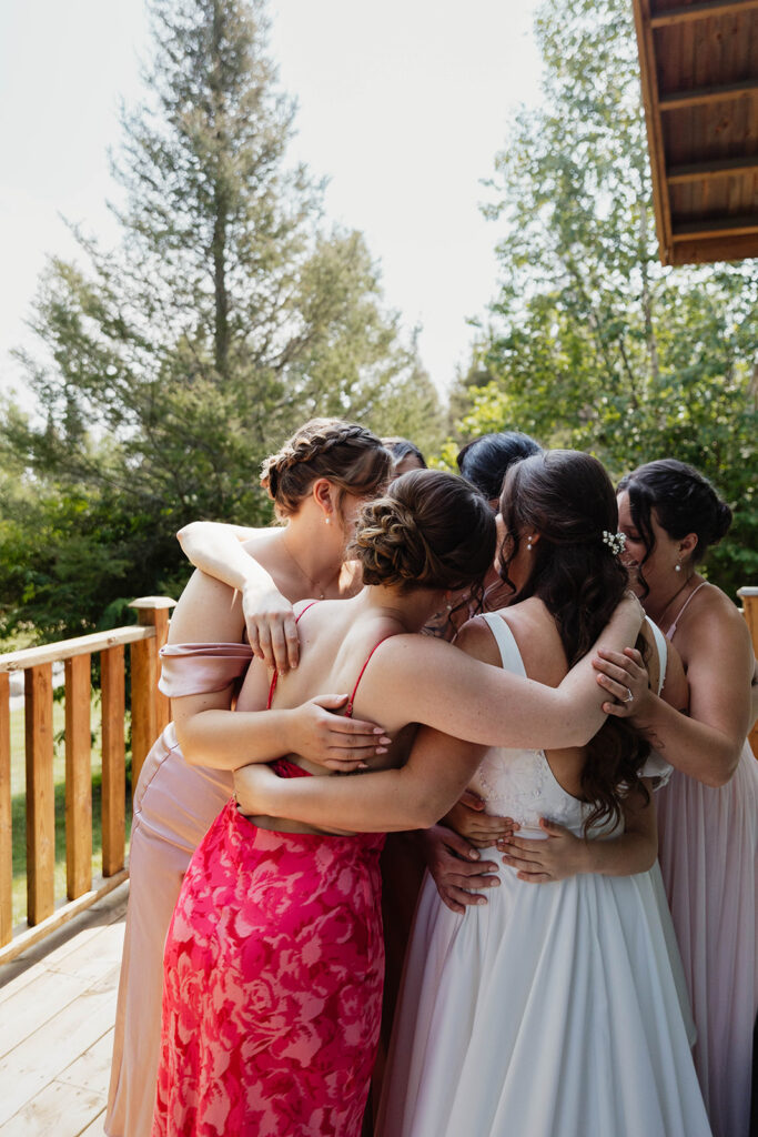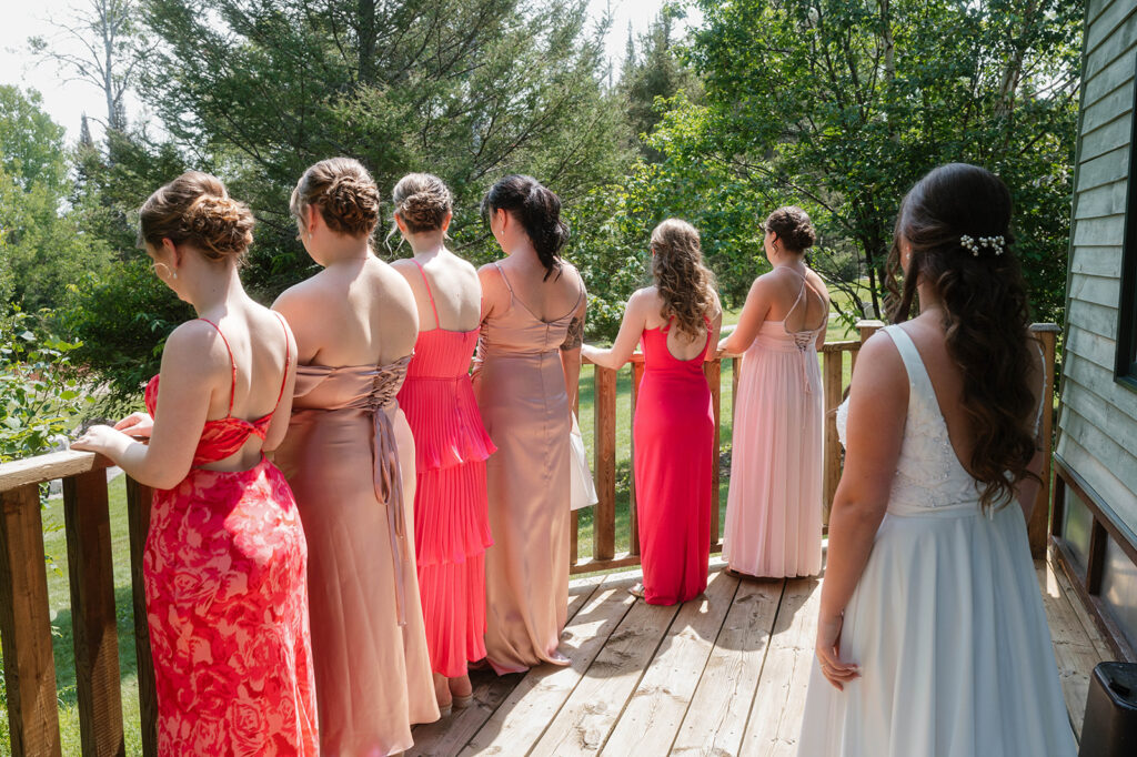 Megan and Cody began their wedding day getting ready on-site in Elk Lake Lodge’s charming cabins. Ashley B. and Paige Beault did a stunning job on hair and makeup for Megan and her bridal party. The bright pink bridesmaid dresses added such a bold, joyful pop of color that stood out beautifully against the natural tones of the forest and lake.