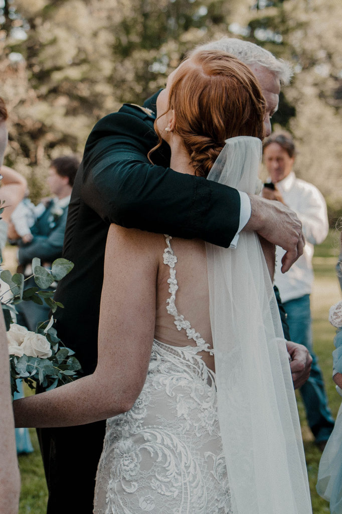 When the ceremony started, the guys truly stole the show. They used the creek from behind the ceremony space to boat into it, screaming after Dylan. It was such a funny show. They had a nephew on a play tractor go down the aisle as the ring bearer, which was met with tons of laughter. It was a sweet mix of laughter & very tender moments in the summer sun. The kiss when they came back down the aisle was a lovely touch.